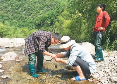 科研人员在进行河流生物调查。 吴金明摄