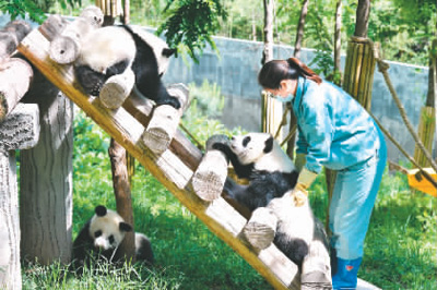 秦岭大熊猫研究中心承担着秦岭大熊猫野外救助、疾病防控、种群繁育等任务,是秦岭大熊猫的生活乐园。图为工作人员与大熊猫互动。 新华社记者 张博文摄