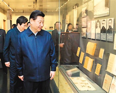 2015年2月15日,习近平在西安市博物院观看了西安都城变迁图、隋唐长安城模型、青铜器及汉唐金银器文物展、汉唐代表性雕塑与唐三彩文物展,听取了古代丝绸之路和长安历史文化等介绍。他强调,一个博物院就是一所大学校。要把凝结着中华民族传统文化的文物保护好、管理好,同时加强研究和利用,让历史说话,让文物说话,在传承祖先的成就和光荣、增强民族自尊和自信的同时,谨记历史的挫折和教训,以少走弯路、更好前进。当天夜里,习近平登上西安城墙,听取了西安城墙保护工作情况介绍,观看了城墙保护状况。