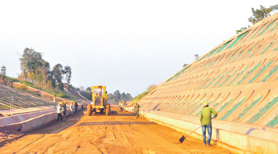 4月15日,在老挝万象省欣合县,中国电建水电十五局员工进行中老铁路路基基床表层砂垫层施工。中国电建水电十五局项目部供图