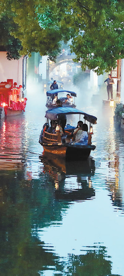 5月1日,游客们坐船游览江苏昆山周庄古镇。华雪根摄(影像中国)
