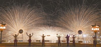 5月3日晚,湖南长沙铜官窑古镇上演了民俗绝技“打铁花”,现场流光溢彩,吸引了不少游客观看。杨华峰摄(影像中国)