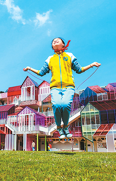 4月24日,浙江省杭州市淳安县富文乡中心小学,复课的学生在跳绳。 王建才摄(人民视觉)