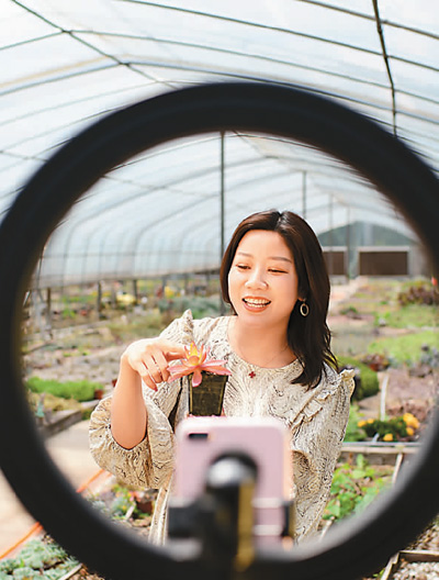 4月25日,江西省九江市柴桑区港口街镇花卉基地,花农在使用网络平台直播推销多肉植物。 杨风胜摄(人民视觉)