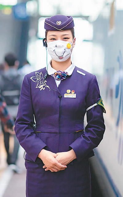 5月8日,在南京火车站站台上,一名列车员戴着“笑脸口罩”迎接旅客上车。 苏 阳摄(新华社发)