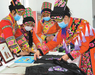 3月,陕西省汉中市宁强县的绣娘正在为客商包装羌绣产品。吴天文摄(人民视觉)