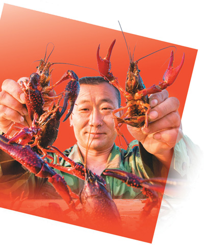 江西省都昌县将小龙虾发展成富民增收、精准扶贫的特色产业。图为5月23日,在都昌县土塘镇坑桥村龙虾养殖基地,养殖户展示新鲜的小龙虾。 傅建斌摄(人民视觉)