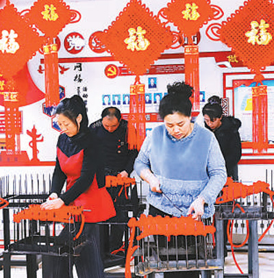 内蒙古自治区扎兰屯市向阳街道向阳村贫困群众编织中国结。韩冷 摄(人民视觉)