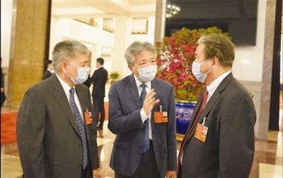 全国政协十三届三次会议开幕会结束后,张仁良委员(中)在大会堂里与其他委员交流。记者 陈斌 摄