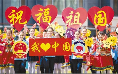 5月21日,内蒙古呼和浩特市玉泉区通顺街小学师生以快闪的形式庆祝全国两会召开,祝福伟大祖国繁荣昌盛。丁根厚摄(人民视觉)