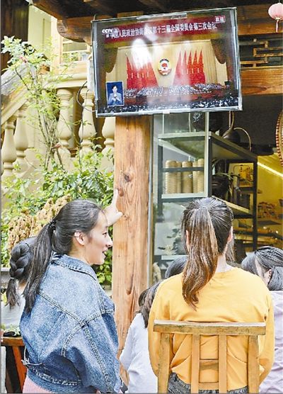 5月21日下午,浙江安吉县余村干部群众收看全国政协十三届三次会议开幕现场直播。窦瀚洋 潘学康摄影报道