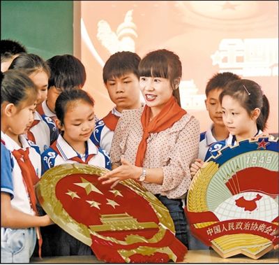 5月21日,湖南省郴州市嘉禾县珠泉完全小学,老师在给学生讲解两会相关知识,师生共庆全国两会的召开。黄春涛摄(影像中国)
