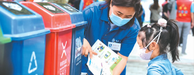 在北京市东城区西花市南里东区,垃圾分类指导员向孩子介绍指导手册上的垃圾分类小知识。 新华社记者 彭子洋摄