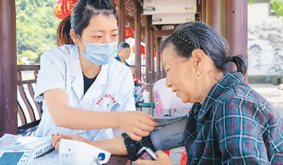 浙江省杭州市淳安县中医院医共体瑶山卫生院的医护人员在淳安县何家村开展义诊活动。 毛勇锋摄(人民视觉)