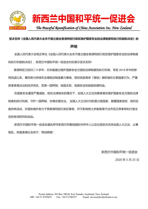 边志立会长并向记者展示了以新西兰中国和平统一促进会会长黄玮璋先生为代表的该会理事会成员们所起草的《声明》,《声明》表示:新西兰中国和平统一促进会全体理事会成员们坚决支持全国人大代表们正在审议的《建立健全香港特别行政区维护国家安全的法律制度和执行机制的决定草案》,其《声明》原文原件如下: