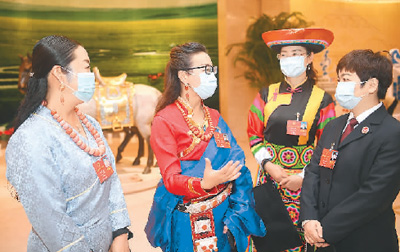 青海省代表团的全国人大代表在一起交流。 闫 旭 祁国彪摄