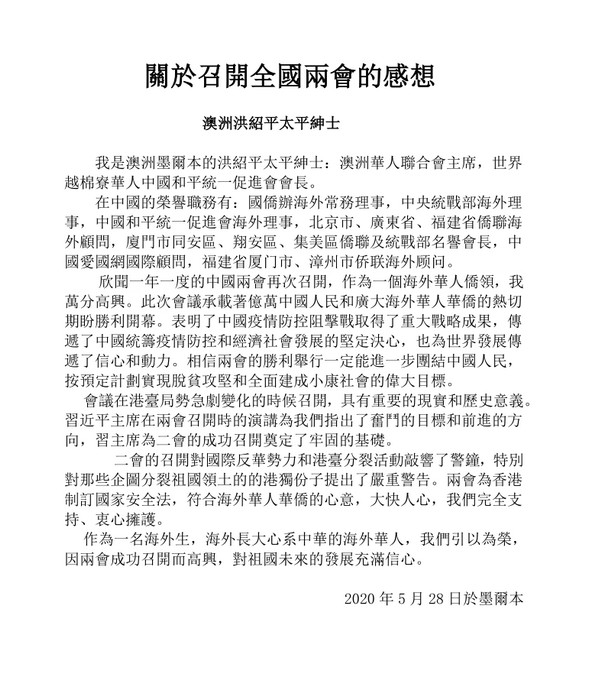 本期所发内容为今日(5月28日)来自澳大利亚华社的两位知名侨领对今年“两会”的感想(原文):