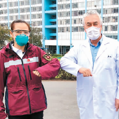 在秘鲁首都利马雷瓦利亚蒂医院,中国医疗专家组组长郭怡(左)与雷瓦利亚蒂医院院长弗伦齐“碰肘”致意。 新华社发