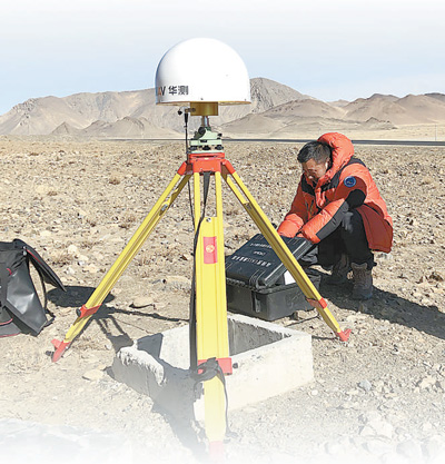 测绘队员用国产华测GNSS接收机在西藏定日县周边开展测量。王万春摄(人民视觉)