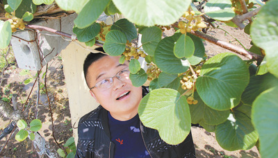 姚力在观察猕猴桃花蕾长势。记者 原韬雄摄