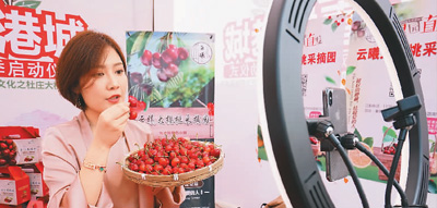 5月30日,网络主播在河北省秦皇岛市海港区杜庄大樱桃采摘节上帮助果农直播销售樱桃。 新华社记者 杨世尧摄