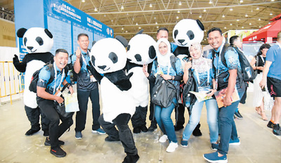 参赛选手在注册中心同大熊猫玩偶合影。