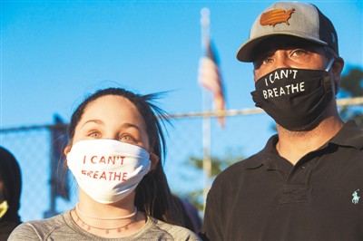 图为在美国明尼苏达州明尼阿波利斯市,抗议者面戴写有“我无法呼吸”的口罩,参加抗议活动。 安格斯·亚历山大摄(新华社发)