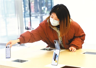 今年一季度,国产品牌华为推出5G旗舰手机P40系列,吸引了不少市民前来体验。图为顾客在位于杭州的华为旗舰店内体验P40系列手机。 龙 巍摄(人民视觉)
