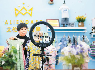 5月15日,位于山东省青岛市即墨区的青岛艾伦达尔服饰有限公司营销人员通过云直播推介产品。 梁孝鹏摄(人民视觉)