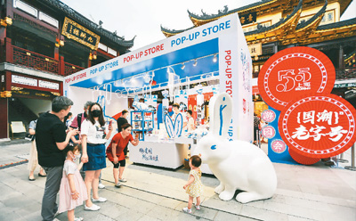 5月22日,汇聚50余家老字号品牌和大批国潮新品的“国潮老字号”游园会在上海豫园商城开幕。图为5月24日,市民在游园会的大白兔快闪店前拍照。 王 初摄(人民视觉)