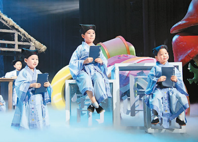 “孩子们,俺老孙来也!”在一群小花旦的簇拥下,美猴王孙悟空闪亮登场,手里闪闪发光的金箍棒转个不停,头顶精神抖擞的翎子有韵律地挑动……