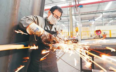图为4月3日,在浙江省湖州市南浔经济开发区的怡达快速电梯有限公司车间内,工人正加紧生产一批发往海外的电梯部件。 张 斌摄(人民视觉)