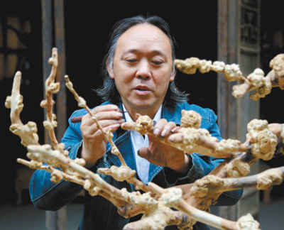 “这刀是圆头,不锋利,适合去皮。”大约过了几分钟,他换了一把平口刀,对“梅花”进行精雕,使其棱角更加分明。“一般小的根雕要经过上千刀的雕琢,这个根雕更复杂,得花点功夫,整个过程估计要几万刀。”彭勇笑着说。