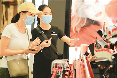 海南省海口市日月广场免税店严抓疫情防控,并推出优惠活动吸引顾客前来购物,让来琼旅客及本岛居民享受离岛免税政策带来的利好。图为消费者在店内选购商品。 张 茂摄(人民视觉)