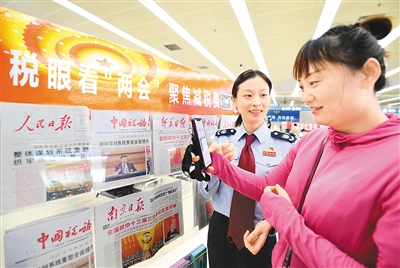日前,南京市鼓楼区税务部门在办税服务厅专门开辟“税眼看‘两会’聚焦减税费”主题报展,向广大纳税人宣传和辅导刚刚结束的全国两会精神,传递国家减税降费好声音,成为办税服务厅一道独特的风景。 孙 军摄 (人民视觉)