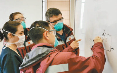 5月29日,在秘鲁首都利马比利亚·埃尔萨尔瓦多医院,中国抗疫医疗专家组成员与医院人员讨论新冠肺炎治疗流程方案。新华社发