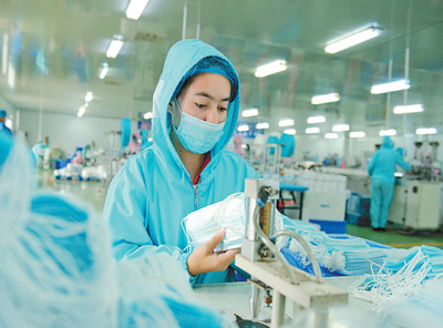 江西省德安县美宝利医用敷料有限公司生产的防护口罩除满足国内市场需求,还出口至韩国、日本、欧美地区。图为公司员工在加紧生产口罩。李诗彪摄(影像中国)
