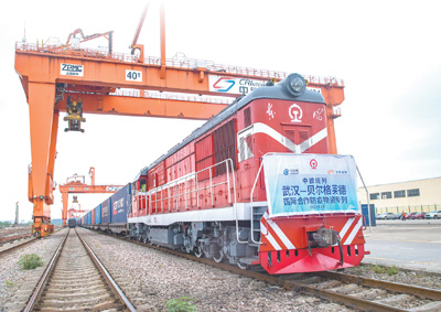 5月9日,满载3500立方米、294.2吨国际合作防疫物资的中欧班列从武汉吴家山站驶出,开往塞尔维亚首都贝尔格莱德。新华社发
