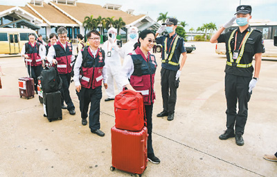 六月八日,应孟加拉国政府邀请,中国政府援助孟加拉国抗疫医疗专家组从海口乘包机出发,赴孟加拉国帮助开展新冠肺炎疫情防控工作。 王程龙摄(人民视觉)