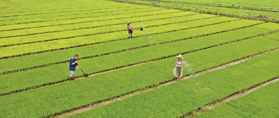 近年来,安徽省滁州市全椒县六镇镇通过“合作社+农户”形式进行规模化育秧,并为水稻种植户提供耕种、管护、收割、收购等一条龙服务,提高规模化效益,帮助农民增收。图为6月10日,六镇镇一家合作社的农民在水稻秧苗田里进行田间管理。 沈 果摄(人民视觉)
