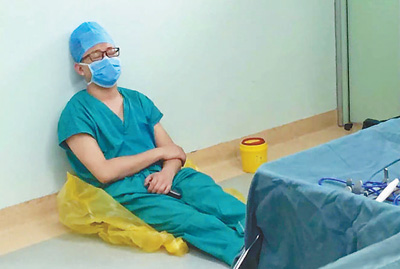 2016年,在几台手术的间隙,于铁夫倚在手术室的墙上休息,这个瞬间被同事拍到。他曾因这张照片被众多网民点赞。资料照片