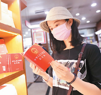 近日,《中华人民共和国民法典》单行本及多个版本开始发行上市,吸引读者驻足选购。图为6月9日,读者在北京王府井新华书店阅读选购《中华人民共和国民法典》。 人民图片