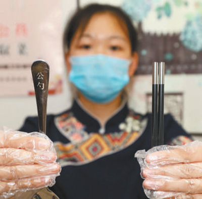 近日,河北廊坊市安次区一家饭店的工作人员在展示公勺公筷。 新华社记者 王 晓摄