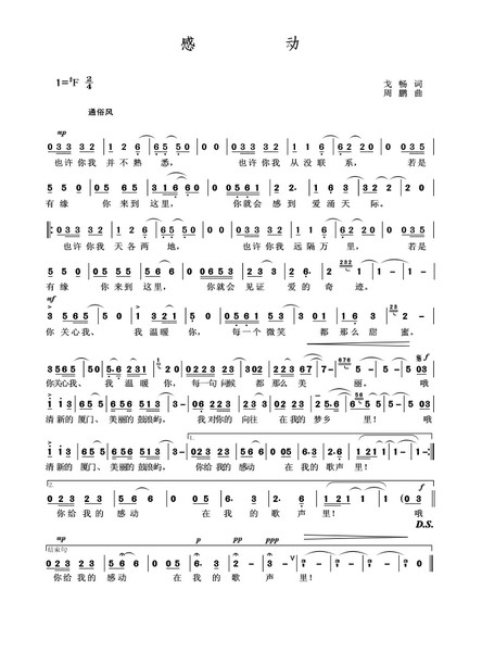 周鹏说,一首歌的结束尾音通常都落在主音“do”上,而《感动》的结束尾音落在了“mi”音上,让人感觉歌曲还未结束。这样微妙的处理,是因为他要营造一种感动还在持续的意境。此外,他还特意在乐谱里写了很多休止符,留给演奏者想象和感动的空间。