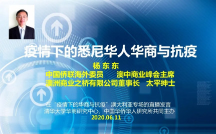 图为作者杨东东在“疫情下的华商与抗疫”澳大利亚专场进行直播时的照片(由清华大学华商研究中心、中国华侨华人研究所共同主办 2020.06.11)