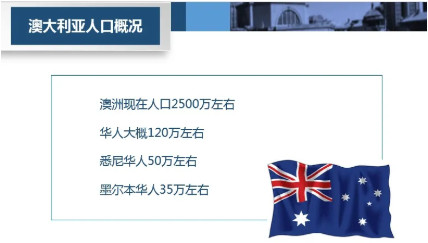 澳洲现在人口2500万左右,华人120万左右,悉尼华人50万,墨尔本华人35万左右。