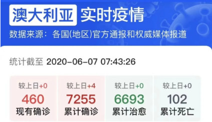 6月9日全澳累计确诊病例总数达7265例,死亡102例,治愈6706人。澳洲从3月25日全面封城,6月1日开始逐步解封。