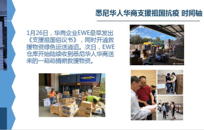 1月26日,华商企业EWE集团最早发出《支援祖国倡议书》,同时开通救援物资绿色运送通道。次日EWE仓库开始陆续收到在澳华人亲自送来的一箱箱救援物资。
