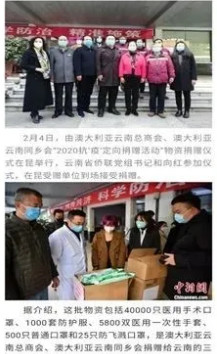 2月4日,澳洲云南商会和悉尼青年华人商会、澳洲河南商会捐献的救援物资到达云南及河南。
