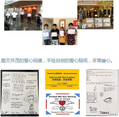 一是华人自发组织了不少捐献群。除了我们会长捐献信息群之外,还涌现出一些医护人员捐献信息群、学生家长捐献群、居民捐献群、校友会捐献群等等。在捐献时为突出华人的爱心,我们会在每个箱子上贴上中英文的共同抗疫,共克时艰的贴纸,有的还请了一些热心的华人小朋友手写、手画了一些图文并茂的爱心祝福语,澳中商业峰会、澳中慈善协会、社区守护者联盟和“生命之光捐献群”捐赠给警察局、养老院、医院的防护用品,都有图文并茂的爱心贴纸,谢谢他们的辛苦工作,接收人感到非常暖心。华人捐赠物资都对质量严格把关,去医院诊所的都给质量好的经过澳洲医疗标准TGA认可防护用品。我们在疫情初的第一时间,在一线门诊和急诊缺防护用品的时候,就把防护用品送到他们手上,医护人员非常感动。